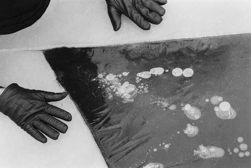 Der wiederkehrende Frost überraschte nicht nur das Wasser in seinen wechselnden Aggregatzuständen. Auch die Luftblasen erstarrten auf ihrem Weg an die Oberfläche. Fragile geometrische Strukturen, gezaubert von der Kälte.