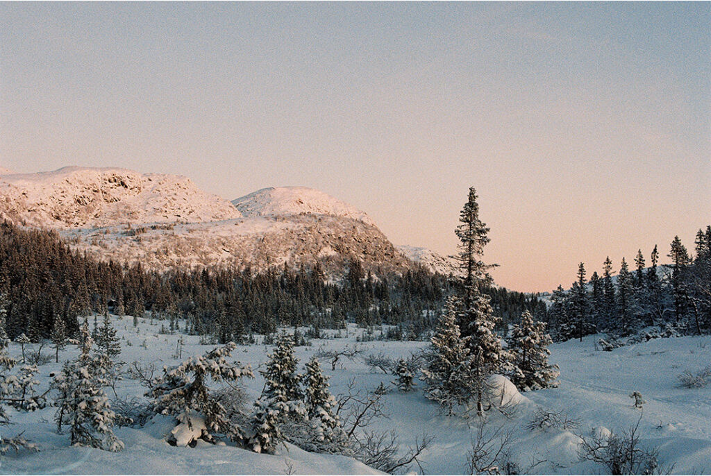 Bei Temperaturen im zweistelligen Minusbereich begab sich die Fotografin gegen 09:00 zum Morgenspaziergang, um das wenige Licht im hohen Norden einzufangen. Der Kamera war’s zu eisig und sie ging in den Notmodus über; der klirrenden Kälte zum Trotz konnte dieser besondere Moment festgehalten werden. Uns präsentiert sich eine erhabene Landschaft im Winterschlaf: die Ruhe erstreckt sich bis zum Gipfel in der Ferne und die einzigen Farben ergeben sich aus dem Lichtspiel des beginnenden Sonnenaufgangs.